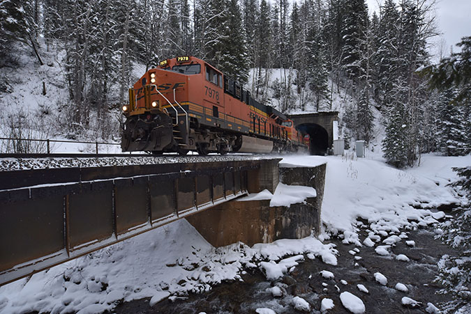 Contrasting the pristine winter landscape, BNSF 7978 emerges from a tunnel in Montana. Conductor Dominic Deeble caught this photo on a Nikon D750.